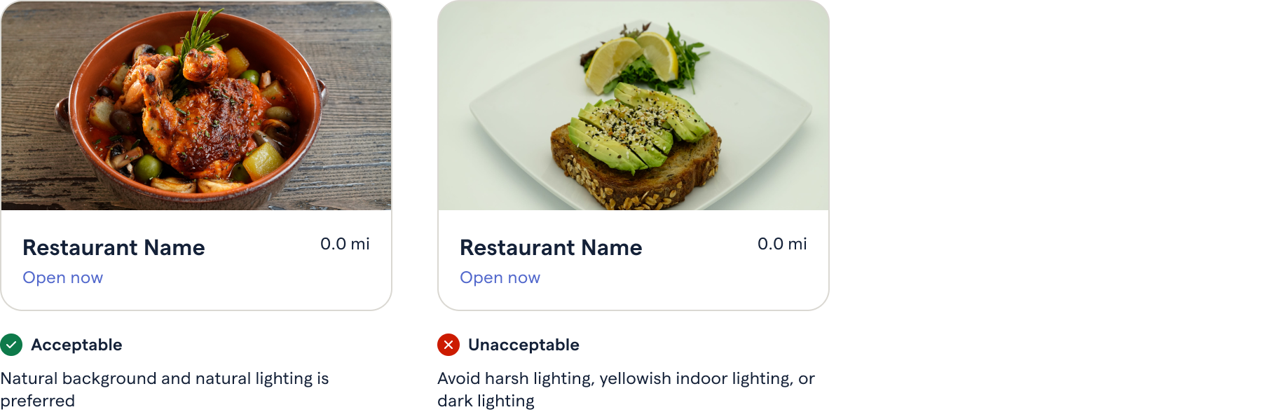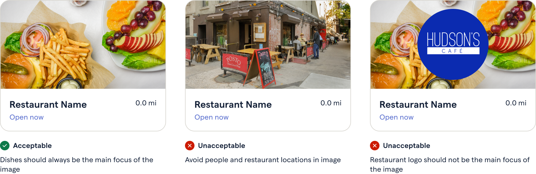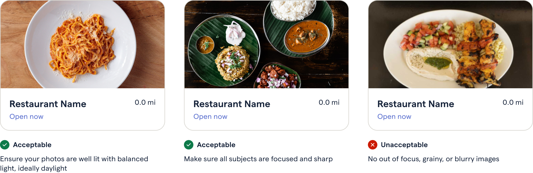 Note: Please include only food items in your cover photo – our team will ask you to replace logos, storefronts, or any other non-food images. We require food images because they are the most helpful for diners scrolling and viewing cover photos in a search results feed.