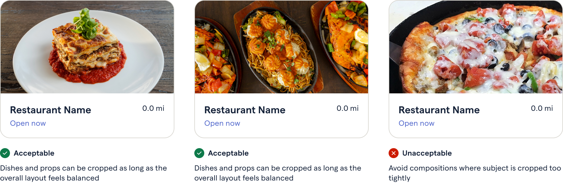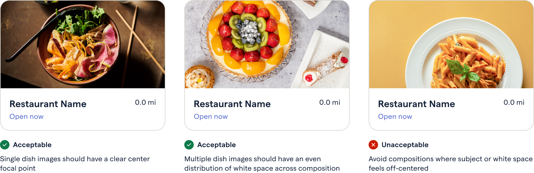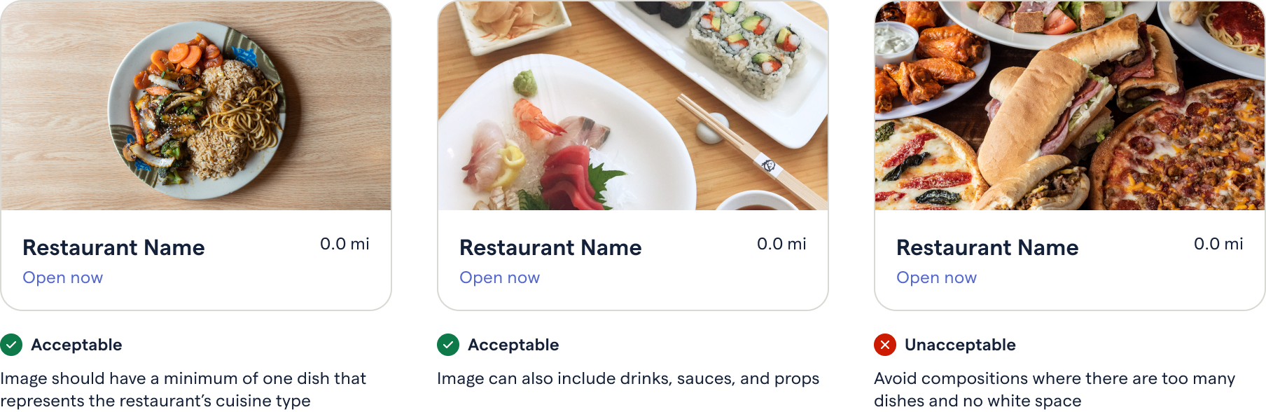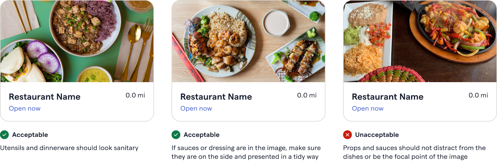 Note: Please include only food items in your cover photo – our team will ask you to replace logos, storefronts, or any other non-food images. We require food images because they are the most helpful for diners scrolling and viewing cover photos in a search results feed.