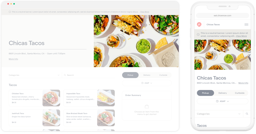 Cover photos are a great way to stand out and showcase your delicious food to diners; whether they’re scrolling a list of restaurants on the ChowNow Marketplace or ordering via your Order Direct website.
