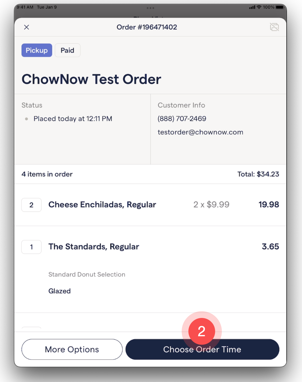 - Here you can see what was ordered, step 2, tap on “Choose Order Time” to accept the order and let the customer know when they can pick it up.