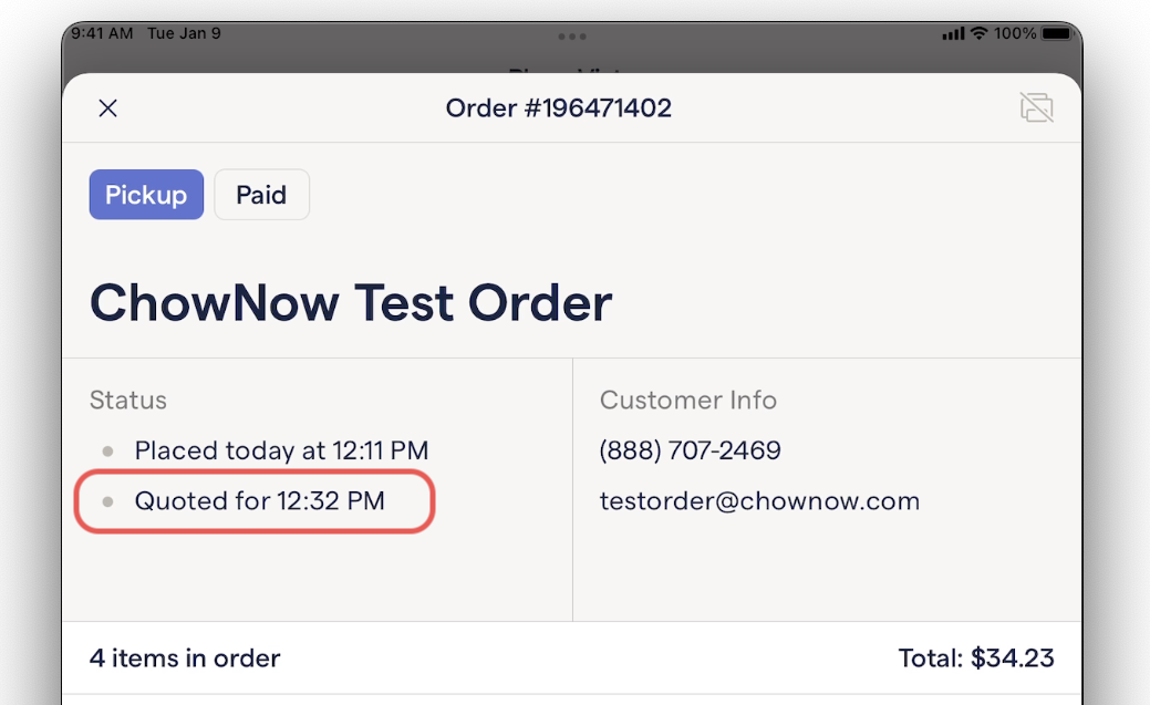 Once complete, you will see an updated order details screen, with the quoted time listed.