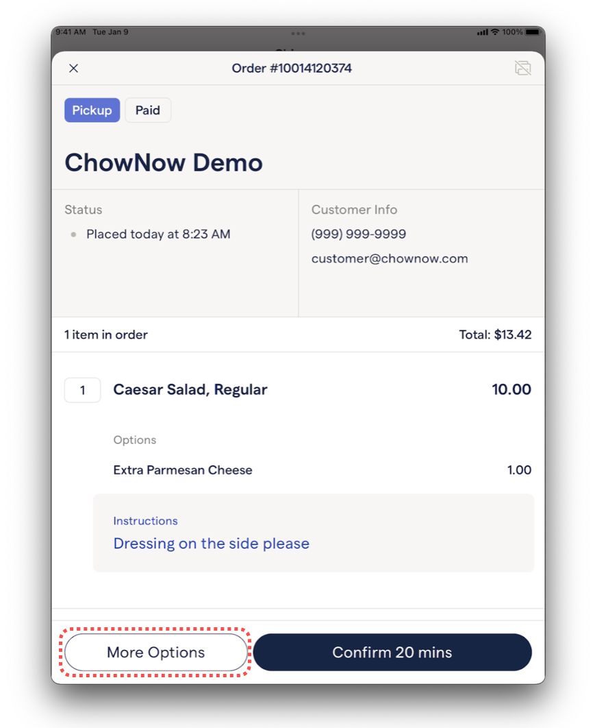 On the next order, the tablet will remember the previously selected time (20 mins) and make that time the recommended preparation time (see example below). If you need more or less time, tap on “More Options” to select a different preparation time.