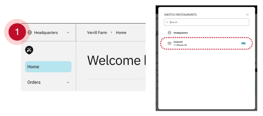 - Login to the ChowNow Dashboard, click “Headquarters” then the location you need to temporary close. ![]()