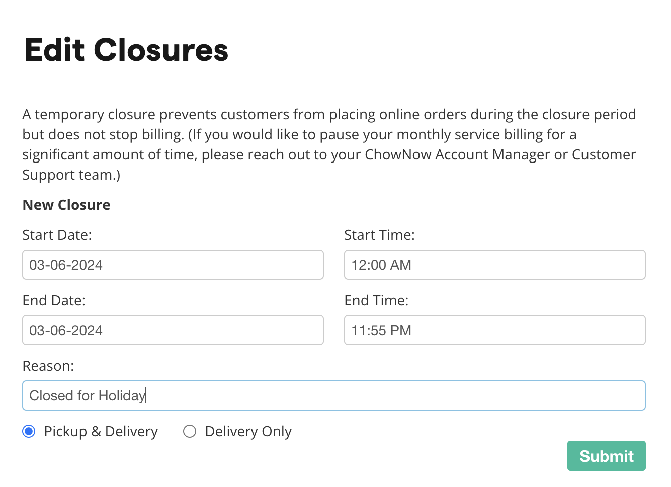 In the ChowNow Dashboard, you have the power to set up a current or future temporary closure for any holidays.