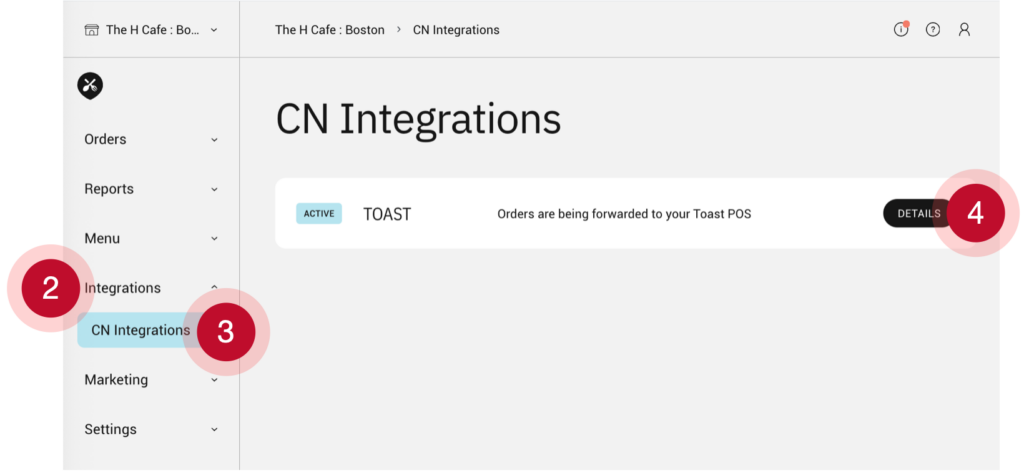 2. Click “Integrations” then (3) “CN Integrations”, and then (4) Details.