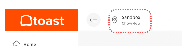 1. Navigate to the Toast Configure Integrations page. Verify that the correct location is selected in the top left corner.
