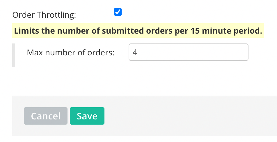 6) Lastly, check the box next to “Order Throttling” and enter the amount of orders you want to allow in each 15 minute window.