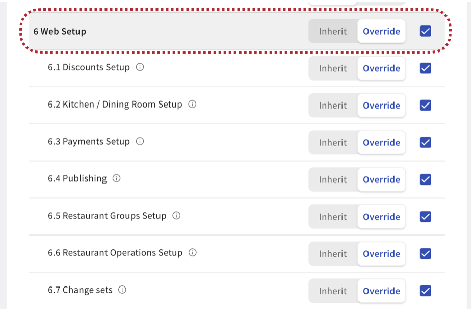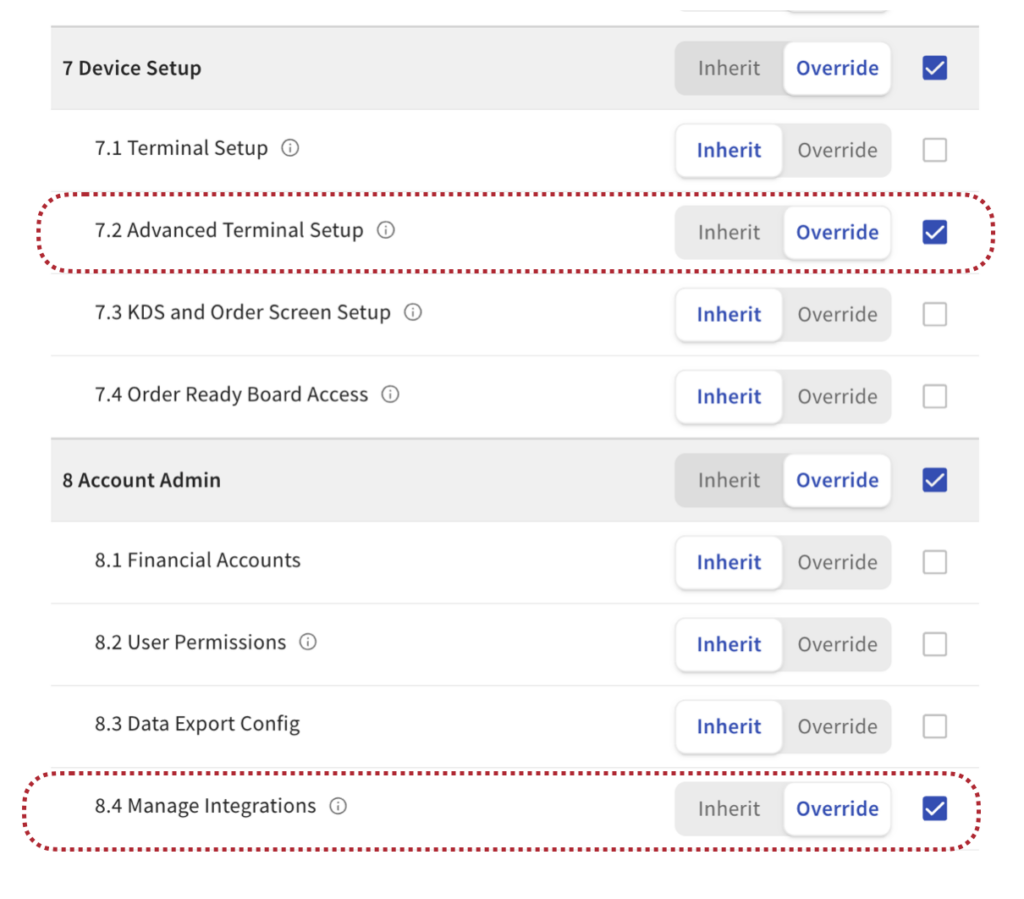 5. Then “Override” and enable 7.2 “Advanced Terminal Setup” and 8.4 “Manage Integrations”