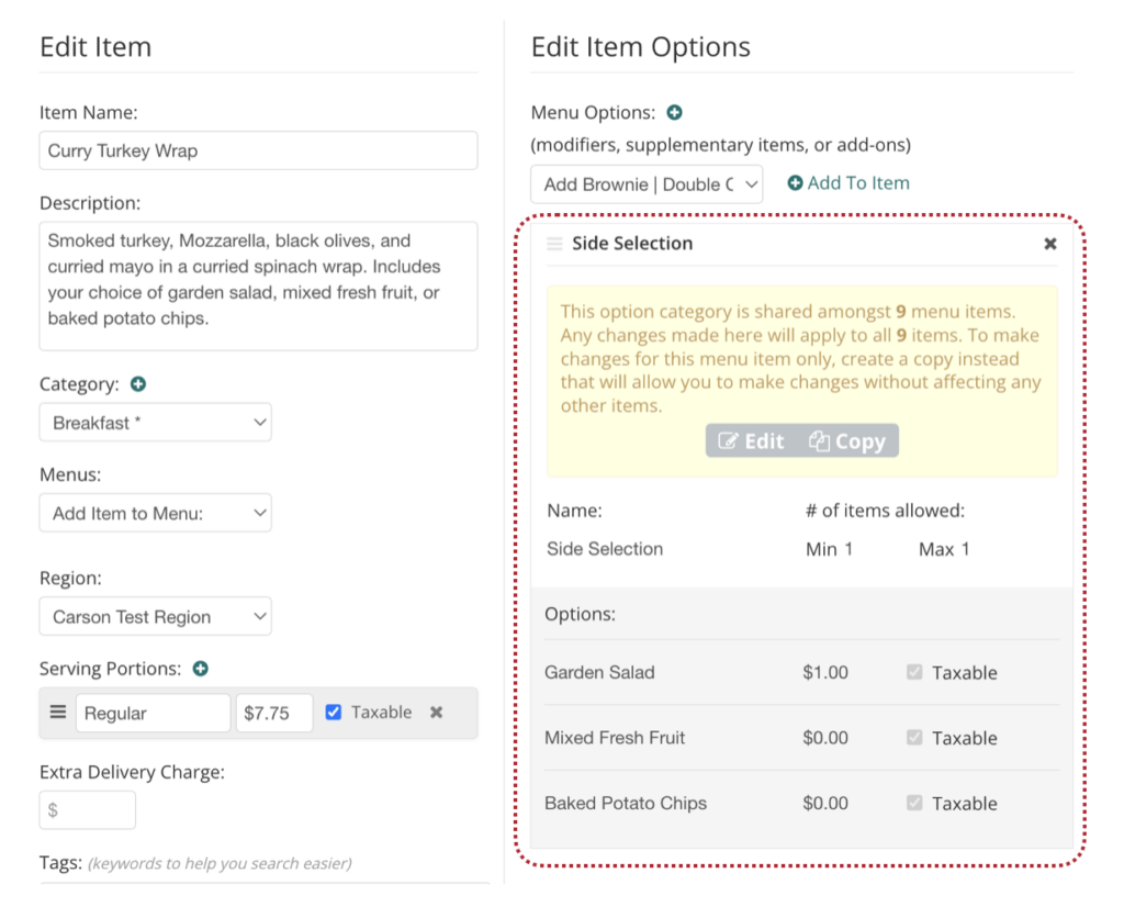 - On the far right side where you see “Edit Item Options”, this is where you can take a look at modifiers applicable to this item and make any necessary changes The dropdown there is essentially your “modification library” and stores all modifiers you have listed anywhere in your menu