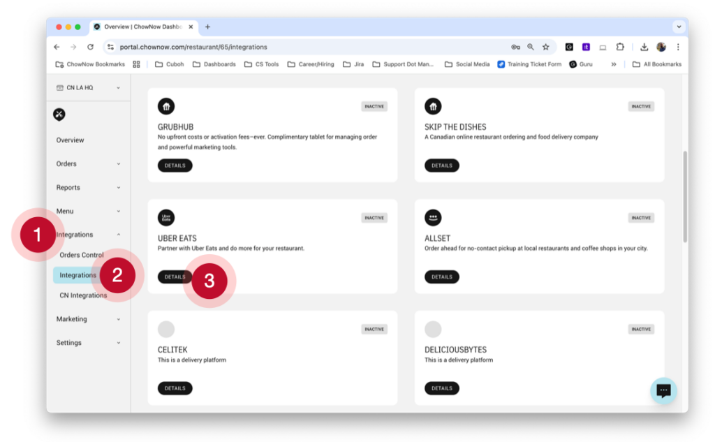- Login into your ChowNow Dashboard, and click on “Integrations” category.