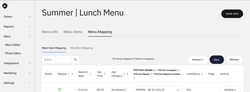Menu Mapping matches your delivery app items and modifiers with the corresponding items and modifiers from your POS system. For example, when a customer orders the “S’mores” from your menu, the Menu Mapping below will tell ChowNow how to enter that item into your POS.