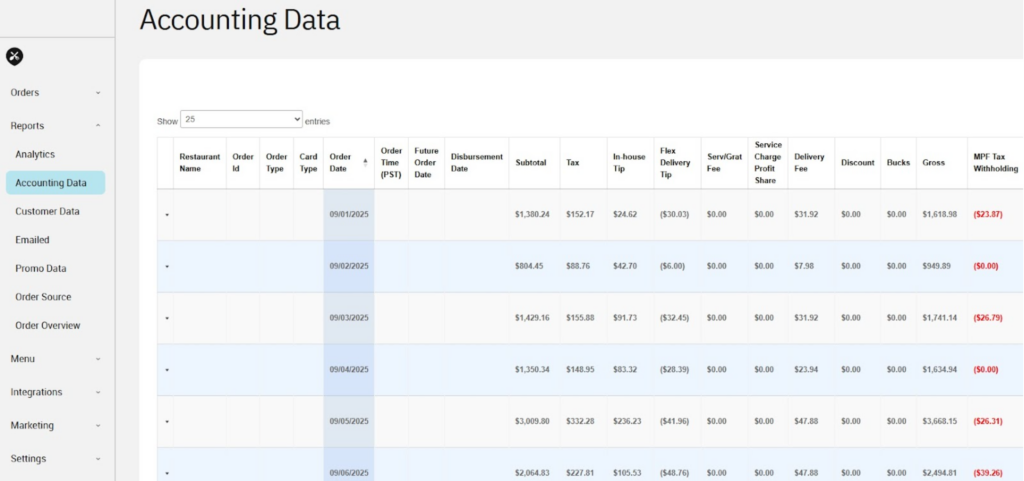 If your location received orders where ChowNow is classified as a marketplace facilitator, a new column titled “MPF Tax Withholding” will appear. This column shows the total amount of tax withheld by Company for each applicable order.