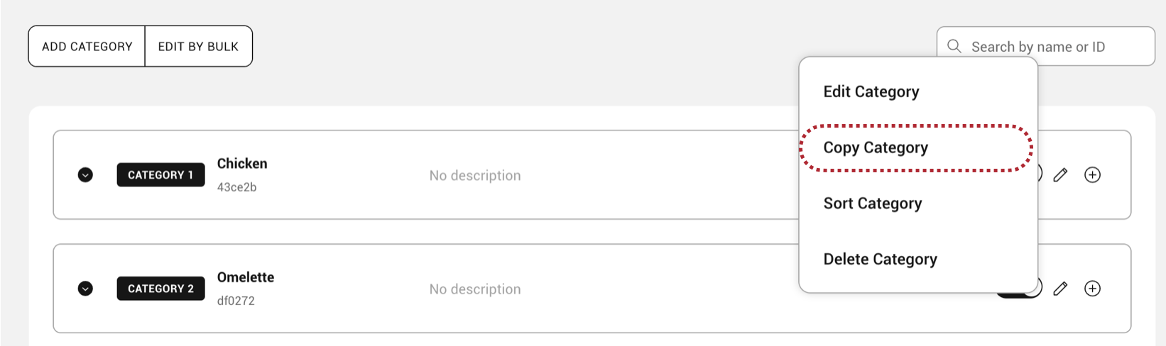 - Click on the edit icon to the right of your category name and select Copy Category.