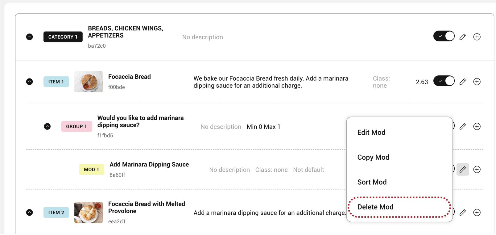 You can quickly hide a modifier from the diner facing menu across all platforms by toggling the switch next to each menu component. To re-enable, just toggle the switch back.