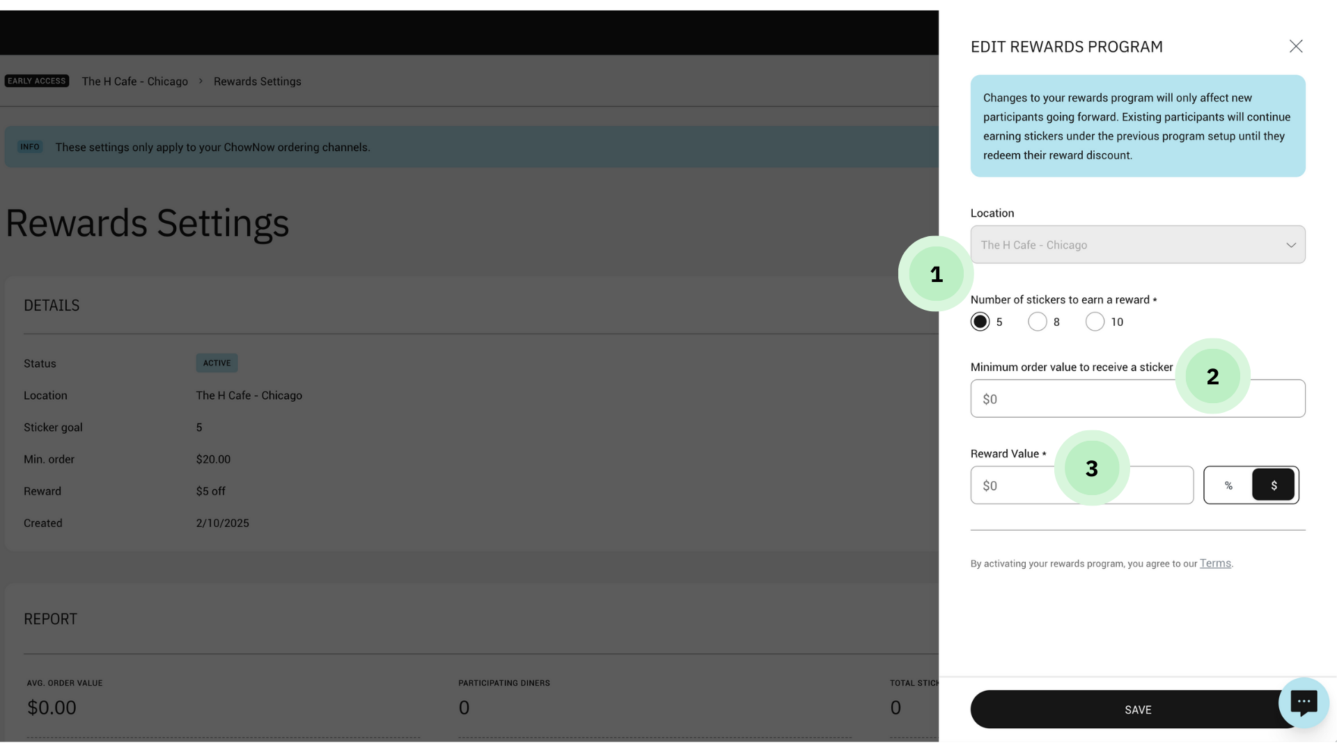 Please note that any changes made to your program will go into effect for new diners going forward. Diners that enrolled in the program before this change will continue to earn and redeem based on the previous setup.
