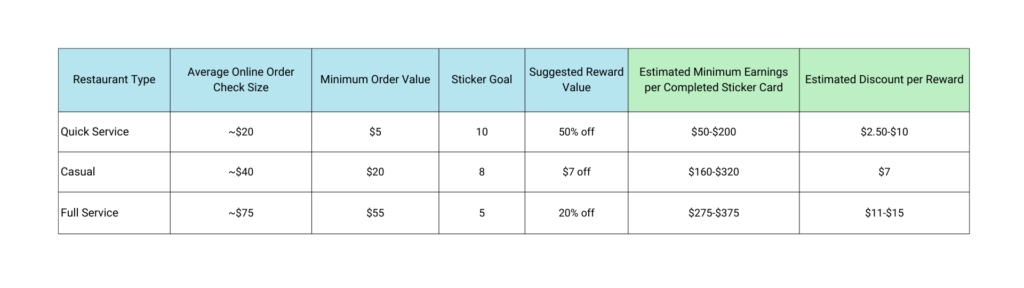 - If customers are not meeting the required order minimum to earn a sticker, consider lowering the minimum spend requirement.