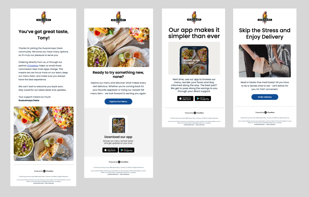 With ChowNow’s Bringback emails we will help your restaurant stay top of mind and remind diners who haven’t ordered in a while to come back. When a diner goes 21 days without purchasing from your restaurant, they will receive a series of 4 emails that remind them to order again.