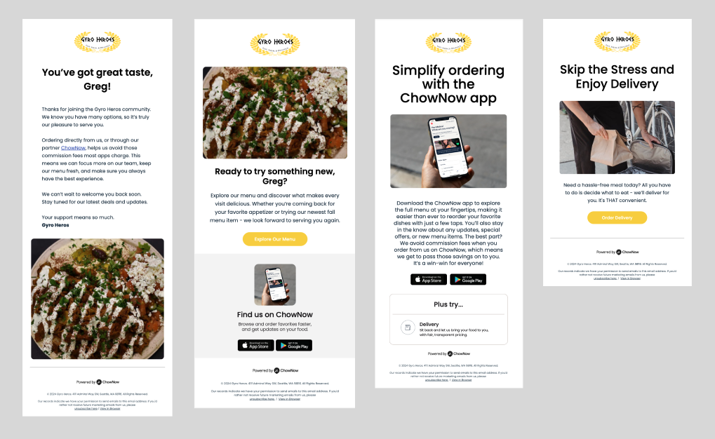 ChowNow offers automated email marketing which lets restaurants send lifecycle emails and monthly promotional emails to their diners.