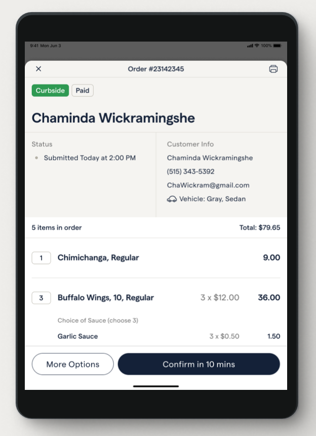 From the order detail screen, you can review & accept orders. It will remember your most recent order ready time on the next incoming order. Choose custom times under “More Options.”