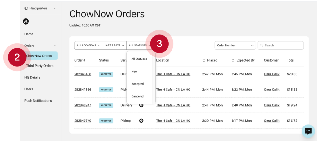 - Click on “Orders” then either “ChowNow Orders” or “Third Party Orders”